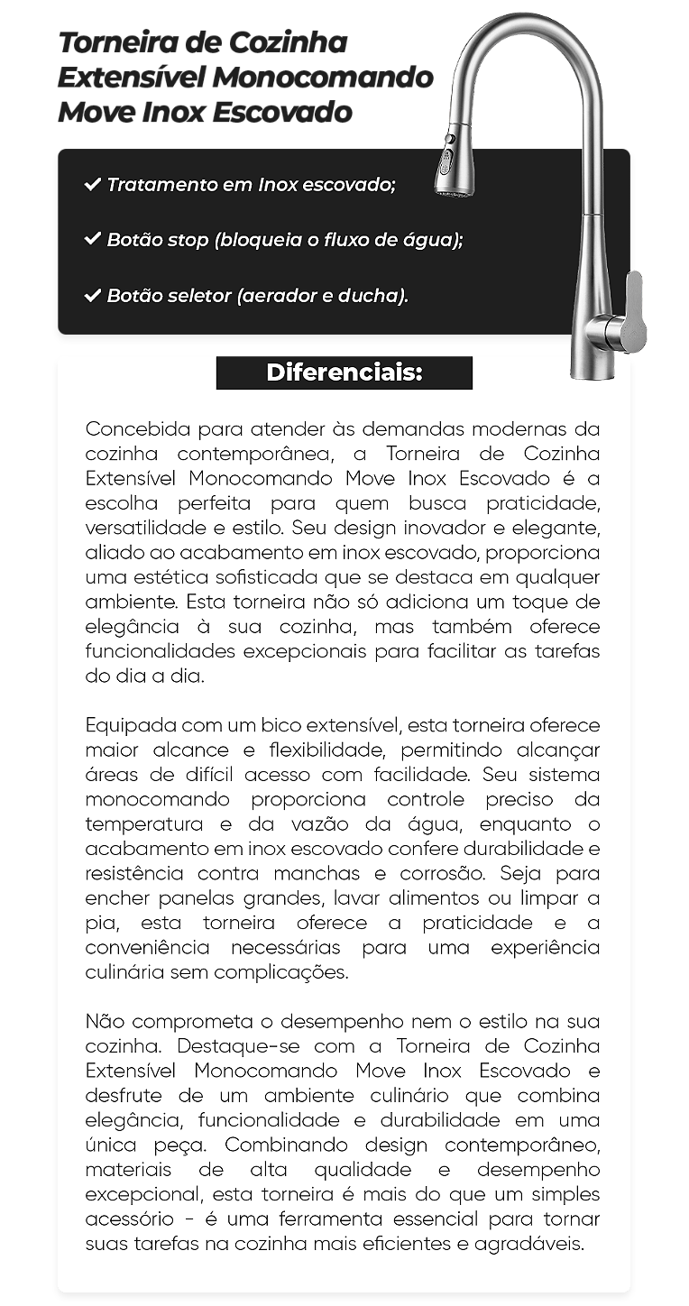 Não comprometa o desempenho nem o estilo na sua cozinha. Destaque-se com a Torneira de Cozinha Extensível Monocomando Move Inox Escovado e desfrute de um ambiente culinário que combina elegância, funcionalidade e durabilidade em uma única peça. Combinando design contemporâneo, materiais de alta qualidade e desempenho excepcional, esta torneira é mais do que um simples acessório - é uma ferramenta essencial para tornar suas tarefas na cozinha mais eficientes e agradáveis.