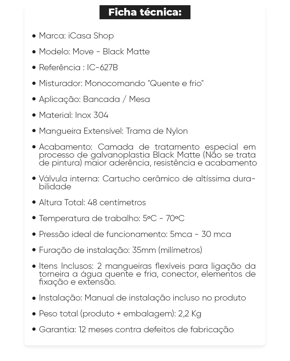 • Itens Inclusos: 2 mangueiras flexíveis para ligação da torneira a água quente e fria, conector, elementos de fixação e extensão.